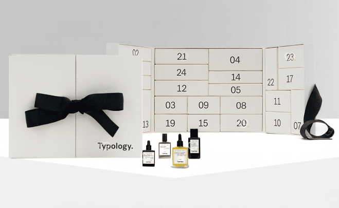 Le calendrier de l’Avent Typology* (179,90 euros) en édition limitée est habillé d’une couverture texturée qui évoque les motifs organiques de la peau et des feuilles. Il contient 24 soins vegan et made in France pour le visage, les yeux, les lèvres, les cheveux, les mains et le corps dont 13 en format vente et 13 nouveautés.